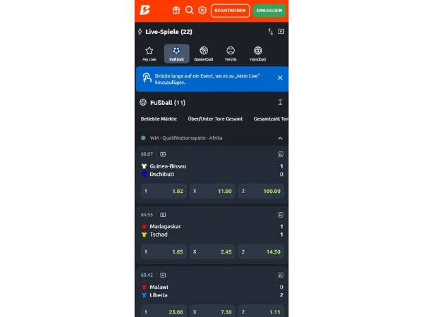 Betano überzeugt mit klaren Bedingungen, modernen Features und starker Fußball-Abdeckung. Im Angebot sind über 20 Sportarten sowie in Live-Spielen oft mehr als 30 Wettmärkte pro Match.