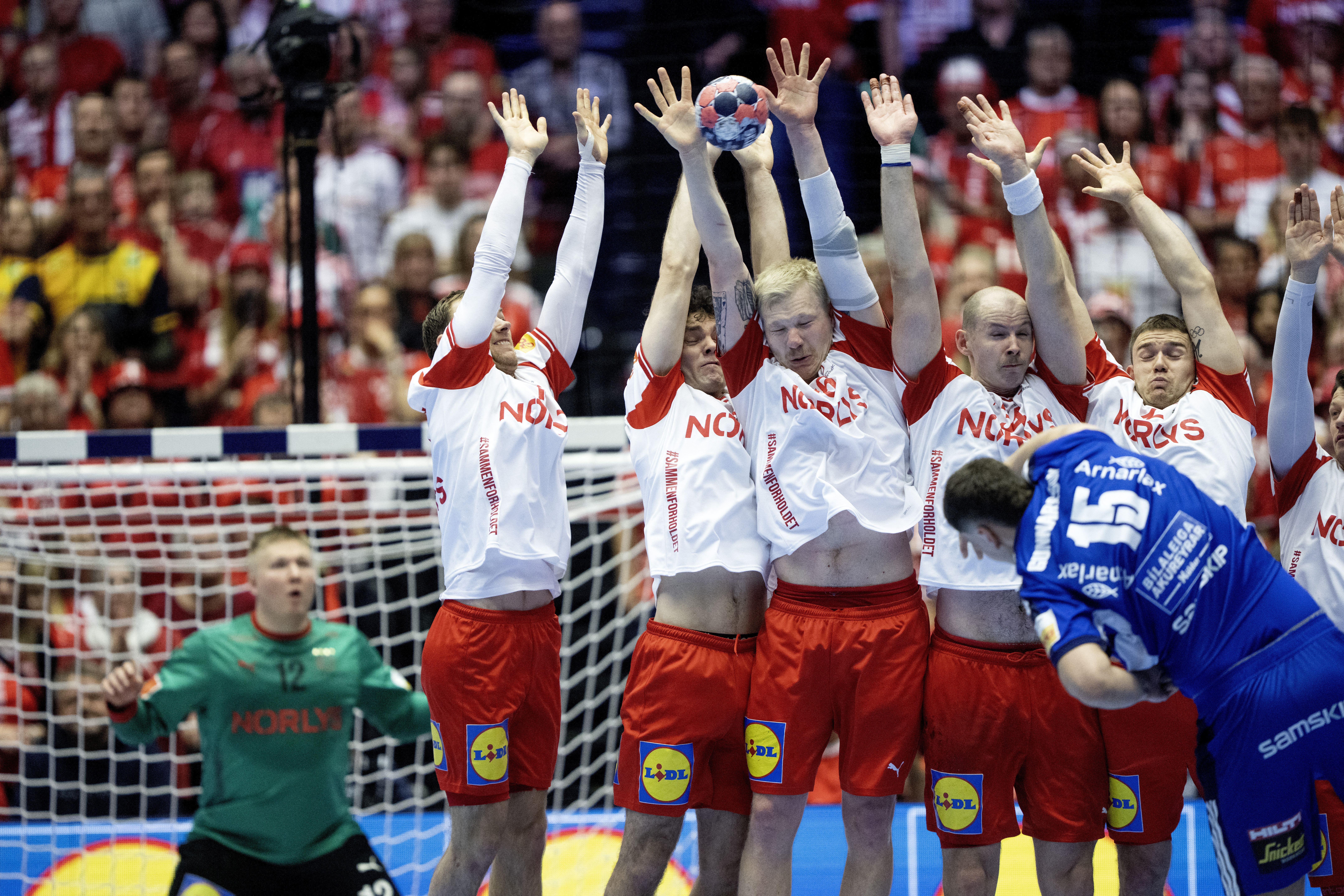 Torwart Möller hält den Siebenmeter von Thorkelsson und die Halle in Herning explodiert. In der nächsten Aktion bringt Johan Hansen die Dänen in Führung.