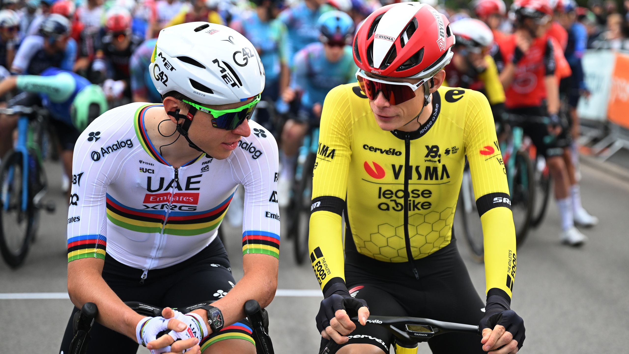 Zunächst attackiert Ben Healy (EF Education - EasyPost), dann geht sein Teamkollege Archie Ryan drüber. Und als nächstes greift tatsächlich Tadej Pogacar (UAE - Emirates - XRG) an. Jonas Vingegaard (Visma - Lease a Bike) reagiert aber umgehend und wirkt sogar reichlich gelassen, während er am Hinterrad des Slowenen klebt.