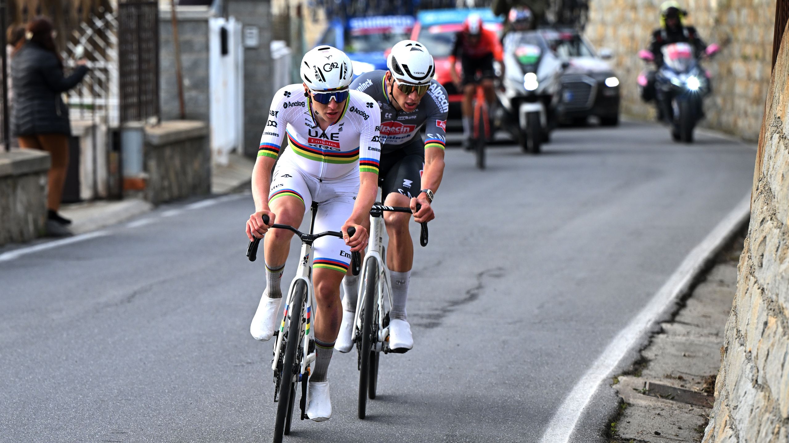 Wieder Nils Politt für UAE. Sie sind fast drin in der Cipressa. Marcellusi schafft es gerade noch so als Erster in den Anstieg. Kurz vorher wurden Veistroffer und Le Berre eingesammelt.