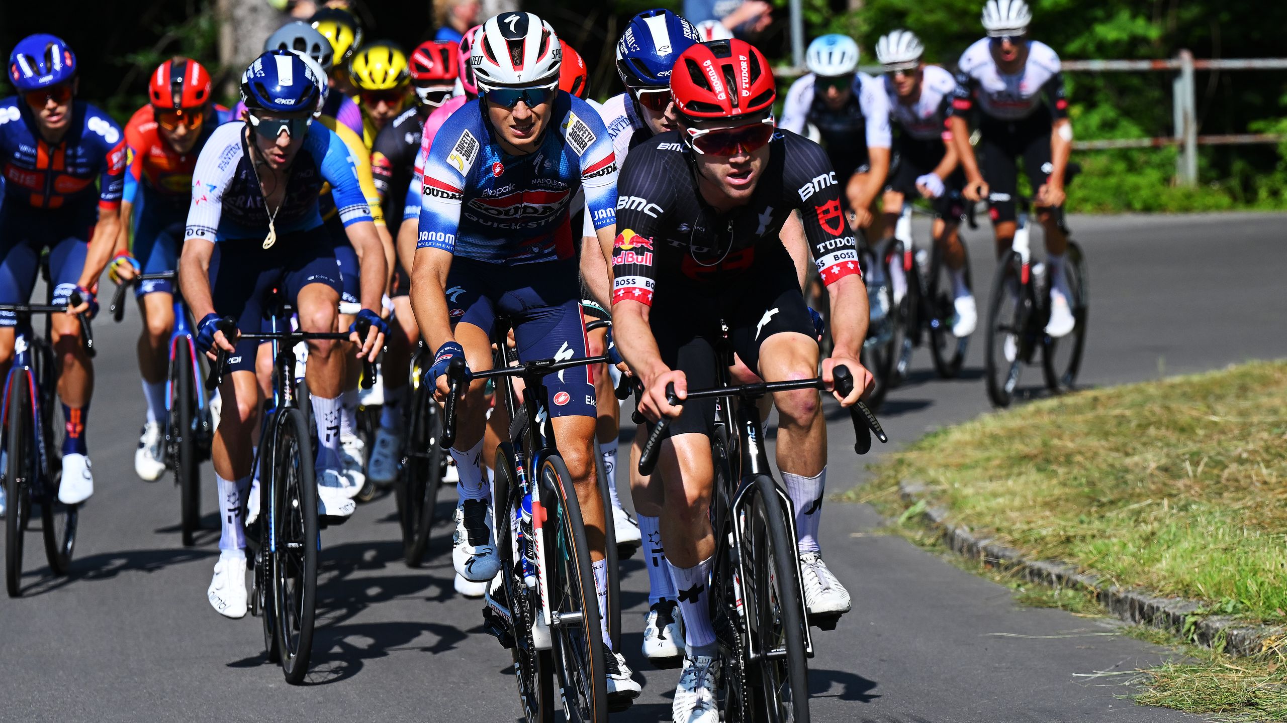 Im flacheren Teil hilft jetzt auch Kämna in der Führungsarbeit mit. Das Trio mit ihm, Grégoire und Alaphilippe hat nur noch rund 20 Sekunden Rückstand auf die Achtergruppe davor - und 1:20 Minuten zu Almeida. Das Spannende daran: Grégoire hat in der Gesamtwertung 25 Sekunden Vorsprung auf Vauquelin, der ihm hier also das Gelbe Trikot abnehmen könnte.