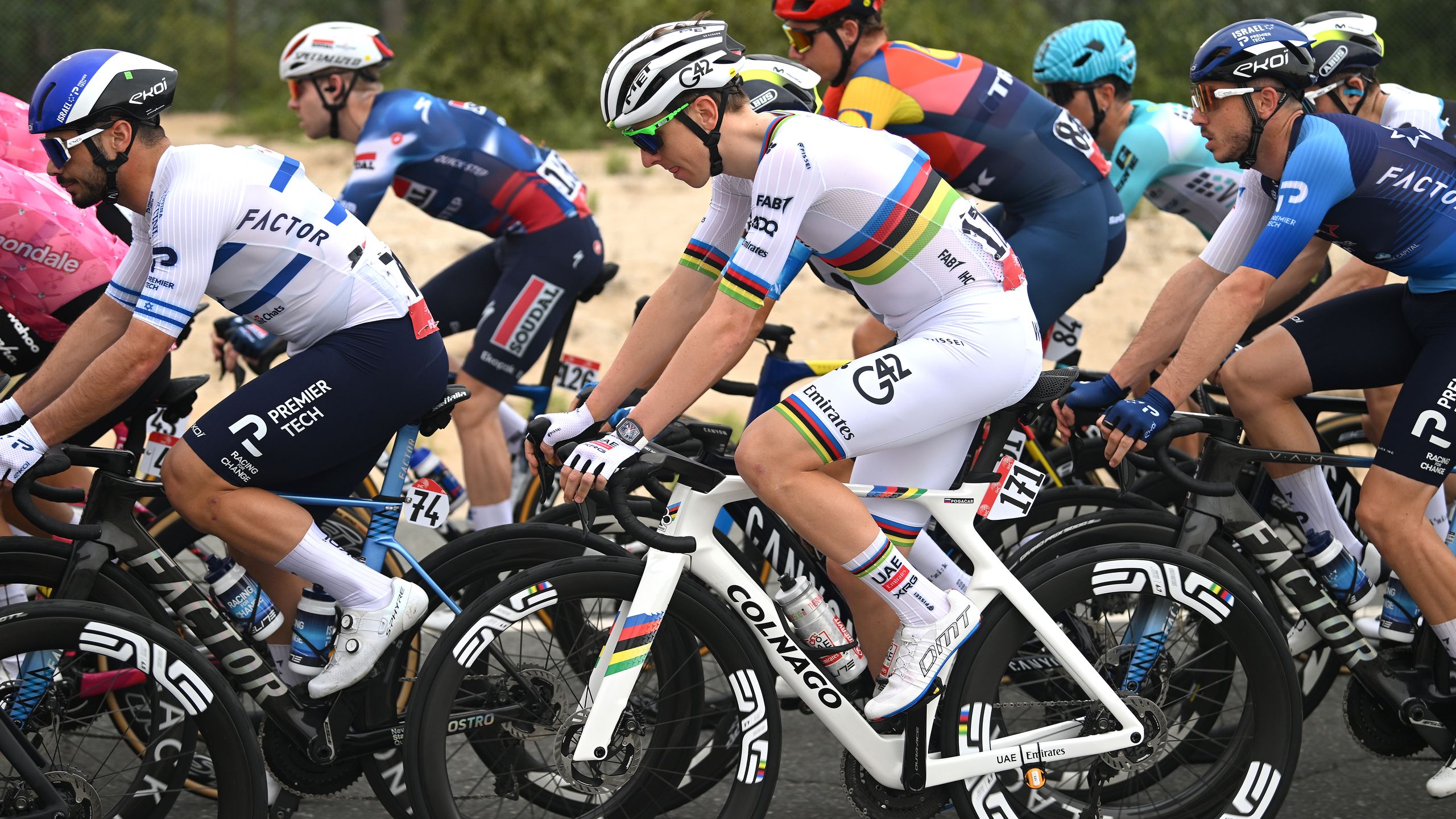 Das Weltmeister-Trikot von Pogacar in erster Reihe, zum ersten Mal heute. Aber das hat da nichts mit Attacke zu tun. Der geht einfach auf Nummer sicher, dass auf den den engen Straßen - aktuell geht es über den Radweg quer durch die bekannte Moreeb-Düne - nichts anbrennt.