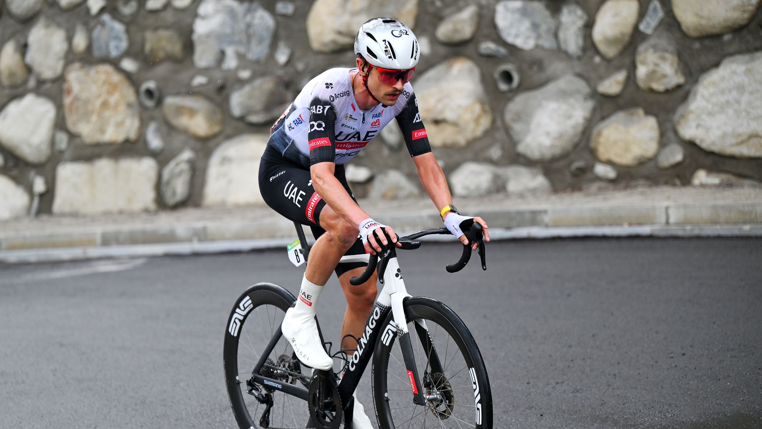 Juan Ayuso (UAE - Emirates - XRG) hat große Probleme das Tempo des Pelotons mitzugehen. Er befindet sich am Ende des Feldes und fällt zurück. Damit ist der Traum vom Roten Trikot für ihn beendet und Joao Almeida ist ganz klar der Teamkapitän des Teams