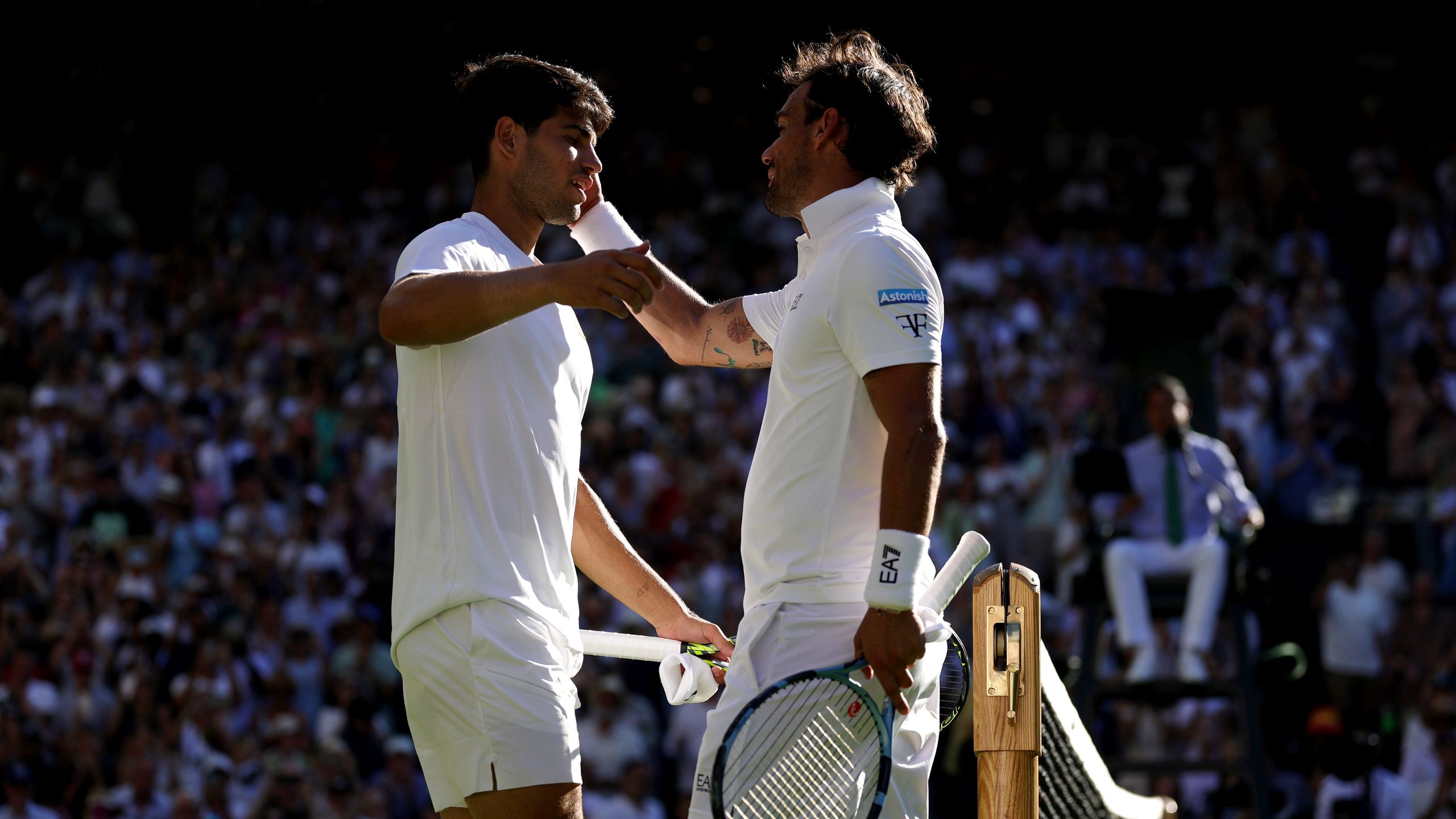Alcaraz und das Publikum zollen Fognini den Respekt, den er für diesen grandiosen Kampf verdient hat. Es könnten die letzten Ballwechsel des Italieners bei den All England Championships in Wimbledon gewesen sein. Er hat angedeutet, dass er sich auf Abschiedstour befindet. Die Fans feiern ihn mit Standing Ovations. Tolle Bilder!